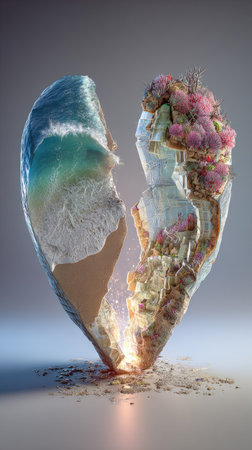 An abstract artwork presents a heart shape bisected to reveal two contrasting scenes. One side showcases an ocean and beach, while the other features floral arrangements. The composition uses bright colors and detailed textures. Ideal for various creative and conceptual projects, including marketing materials.