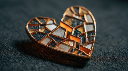 A mosaic heart, crafted with various shapes and colors, rests against a dark, textured backdrop. The handmade piece, features copper outlines and interior sections of white, black, gold and orange hues. The detailed artwork suggests commercial uses, suitable for designs and visual concepts.