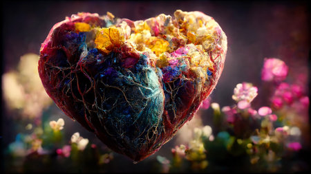 A split heart showcases contrasting imagery. One half features a serene coastal landscape with turquoise waters. The other reveals a burst of colorful flowers. The composition utilizes vibrant hues and artistic style. This imagery can be useful in commercial projects related to love, loss, and artistic expression.