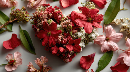 A heart-shaped composition of various colorful flowers and leaves on a soft gray background, ideal for themes of love, romance, and beauty in design.