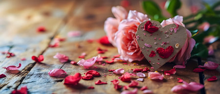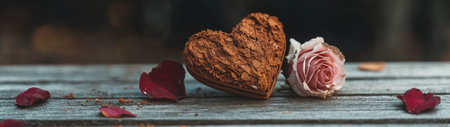 Romantic heart-shaped chocolate and rose petals on wooden background