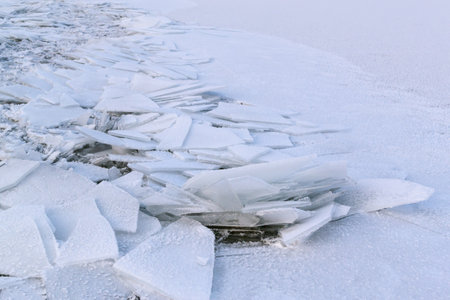 Broken ice on the edge of a lake at winter
