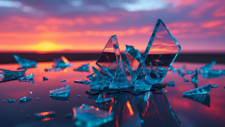 Shattered glass glistens in the sunset, creating beauty amid chaos.