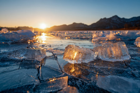 Golden rays cast sparkling patterns on broken ice fragments across a tranquil, icy expanse, with distant mountain outlines under a vivid sunset sky.