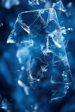 Deep blue vertical background with elements of broken glass or thin ice. The main shard floats amidst smaller fragments, creating a serene atmosphere.