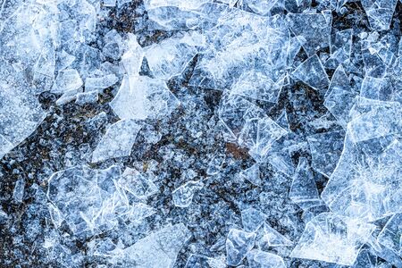 Close up of pieces of ice on frozen lake or river. Shatters of cracked ice closeup. Broken ice on the lake. Winter background.