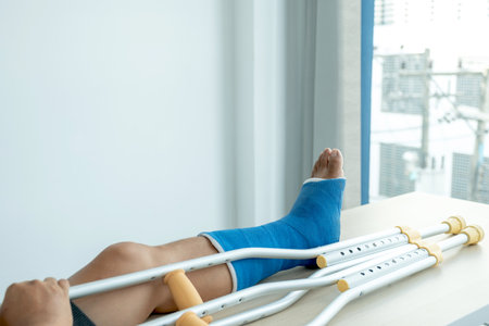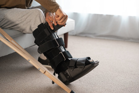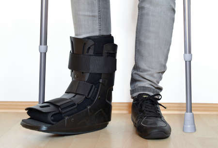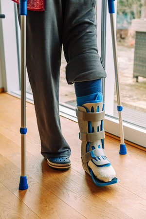 Detail of broken leg or foot injury walking on crutches with leg brace, attaching orthosis or bandage to support the ankle joint after leg surgery