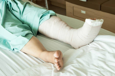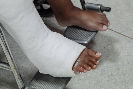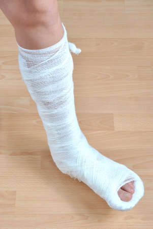 Athletes leg in a plaster cast. Leg in a bandage, in plaster