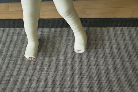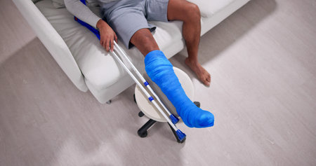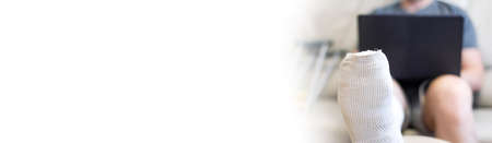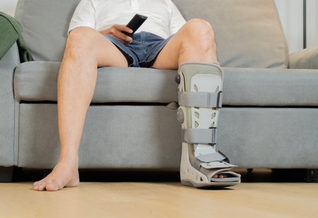 Close up shot of a man broken and bandaged leg as he sits on a sofa at home. He is undergoing rehabilitation after an injury or trauma, highlighting the medical recovery process and treatment.