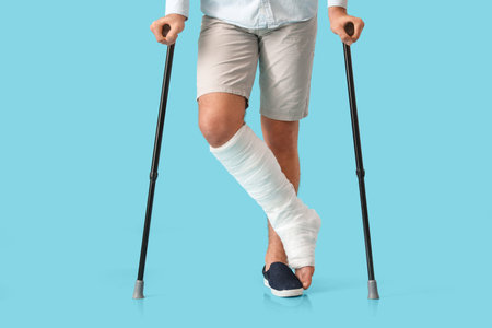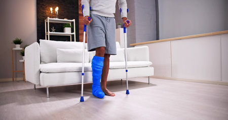 Man With Broken Leg Using Crutches For Walking On Blue Carpet