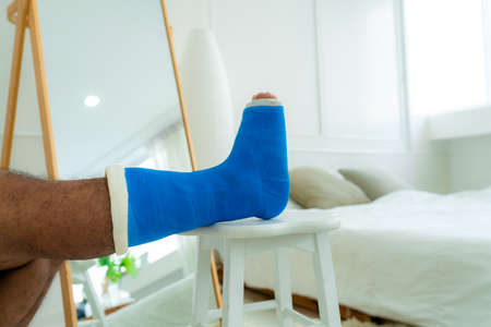 On the right side of the right foot, a man who had a fractured bone accident had a blue cast wrapped around his leg from foot to shin in the bedroom.