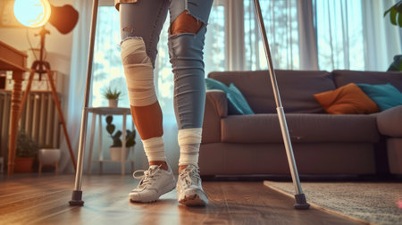Woman with broken leg in cast makes good progress and walks with crutches in the living-room. Young patient undergoes rehabilitation at home