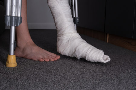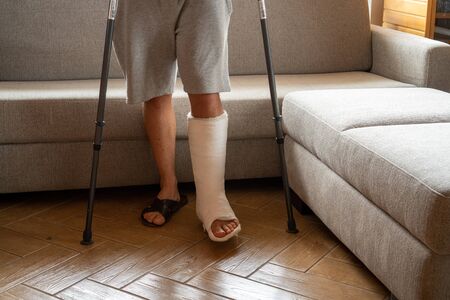Broken leg or foot injury man walking on crutches with bandaged leg at home, patient on rehabilitation period, painful swollen foot, person not be able to walk on it, severe fracture, protective cover