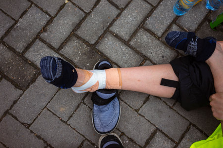 Woman with broken leg. female bandaging foot on the floor. The concept of a sore person with a limb injury. Close-up.