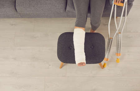 Female broken injured leg relaxing on stool in cast and metal crutches nearby at home over flooring, top view. Trauma, injury, recovery, rehabilitation concept