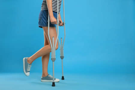 Young woman with axillary crutches on light blue background, closeup. Space for text