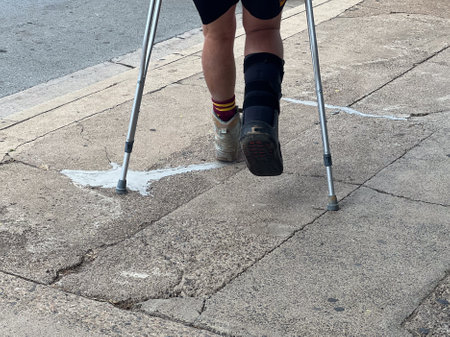 Man's leg uses crutches to walk after surgery recovery injury broken bones.