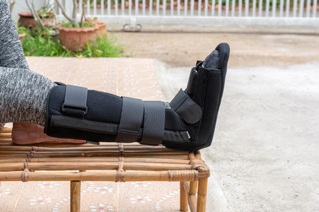 women broken feet with a grey plastic boot ankle brace injury protecting boot