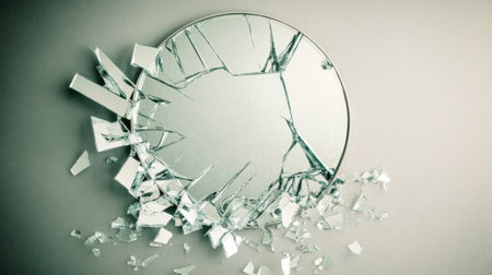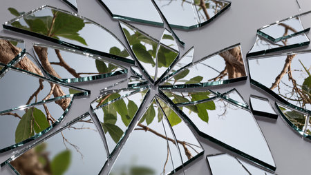 Broken mirror shards on a plain surface, illustrating change and reflection.