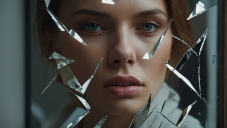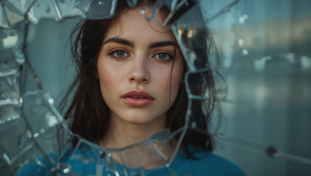 Close-up portrait of a woman framed by broken glass, her intense gaze and natural makeup highlighted by soft lighting. Reflective and moody atmosphere.