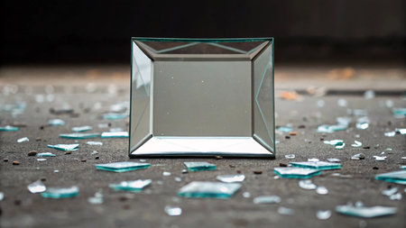 A striking image of a shattered mirror reflecting chaos and beauty. Broken glass pieces scatter around, creating an abstract and artistic display ideal for decor or design themes.