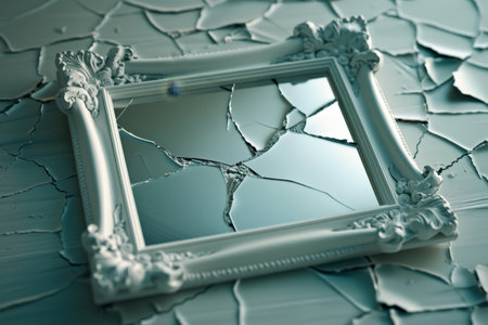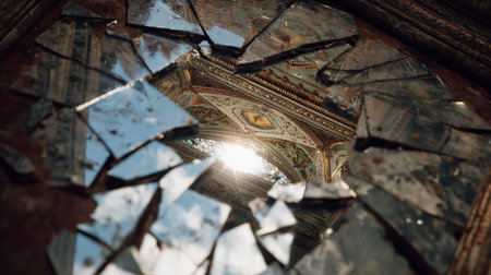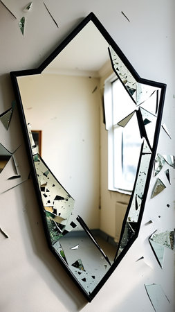 A broken mirror sits on a wall, reflecting scattered shards and the surrounding environment, A mirror reflecting shattered and distorted images, AI Generated