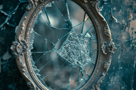 This striking image showcases a cracked antique mirror with an ornate frame, evoking a sense of beauty and mystery. Ideal for artistic context.
