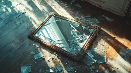 Shattered mirror pieces are spread across a wooden floor as sunlight filters through a dusty space, neglect revealing.