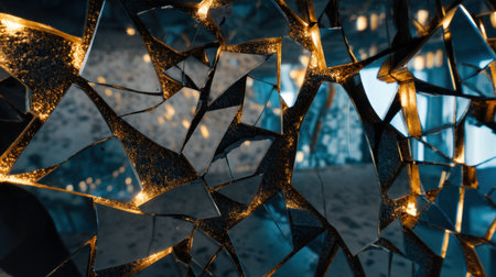 A dynamic and artistic representation of shattered glass fragments, showcasing reflective surfaces and a play of light. Ideal for modern design projects.