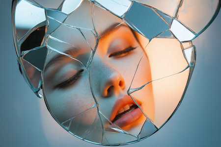 Close-up of a woman's face reflected in two pieces of a shattered mirror, creating a fragmented and emotional portrait. Soft lighting highlights the delicate features and the broken glass.
