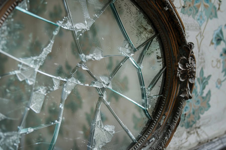Broken mirror fragments, bad omen, superstition. Close-up, selective focus.