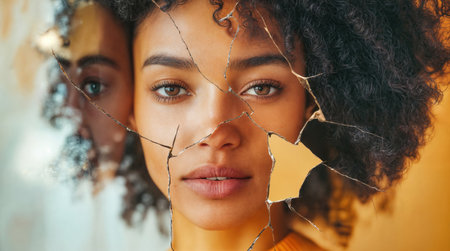 A woman's face is reflected in a shattered mirror. Concept of fragility and vulnerability, as the woman's reflection is distorted and fragmented