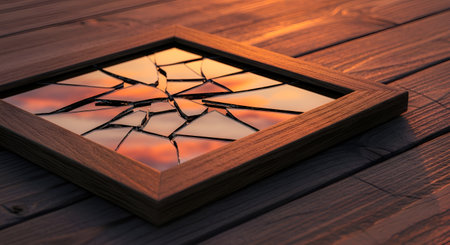Evocative shattered mirror reflects a warm sunset. Perfect for conveying themes of change, loss, new beginnings, or altered perspectives.
