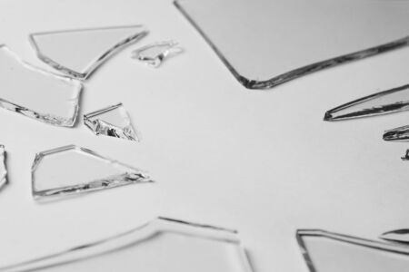 Broken glass background for your images isolated on white. Many large glass fragments scattering from a hammer as a concept of violence