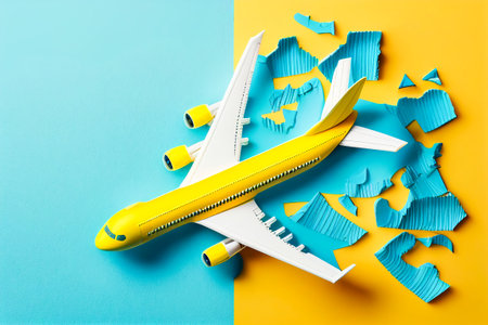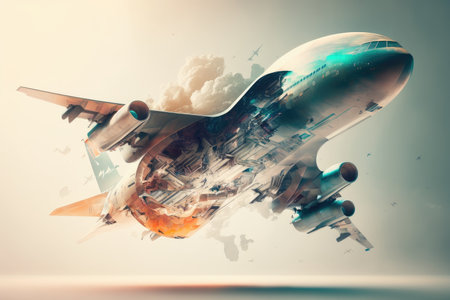 A captivating aerial shot of an airplane visually disintegrating against a bold yellow background, capturing motion and creativity. Generated A.I.