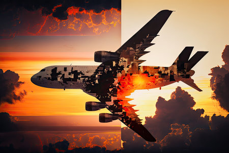 double exposure of plane flights on orange sky with sunset clouds, created with generative ai