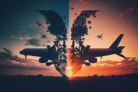 double exposure image of plane flights against sunset sky, created with generative ai