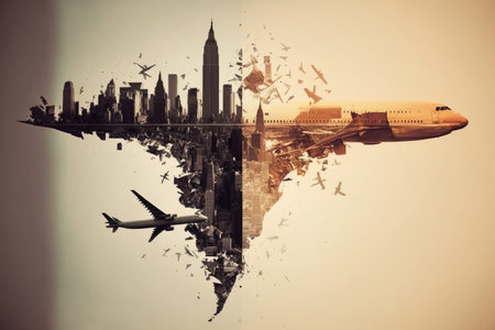 double exposure commercial flights traveling through airport to take off, created with generative ai