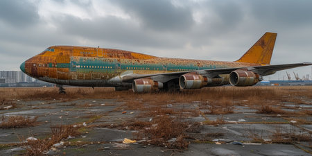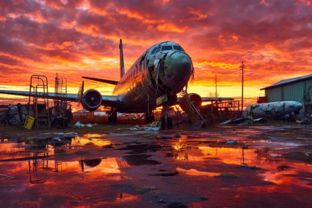 an old airliner, reimagined by industrial light and magic, sits in an airport with debris trailing behind. the y2k aesthetic of dark silver and amber colors adds to the industrial urban scene. this ultra-detailed 8k photo showcases the unexpected beauty of the aircraft amidst its surroundings. ai generated