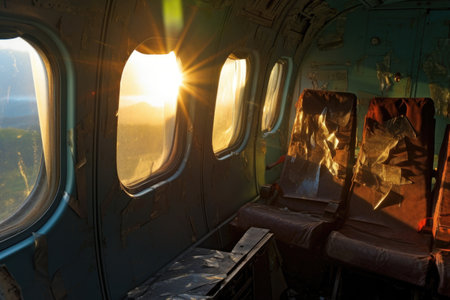 sun shining through broken airplane windows, created with generative ai
