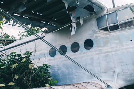 A close-up of an old wrecked passenger plane that has been decommissioned and stands for tourists. The fuselage shows traces of rust and chips. Parts of the metal structure are visible on the wings