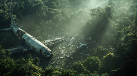 plane wreck surrounded by imposing jungle foliage, with vines and creepers growing on the wreckage, created with generative ai