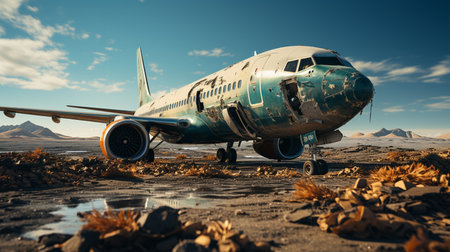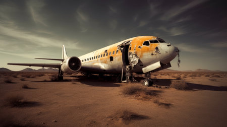 an airplane is left abandoned on the side of a deserted road, with shattered windows and missing tires. the surrounding landscape is a barren expanse of scrub brush and sand. the scene is captured with volumetric lighting and professional photography. ai generated
