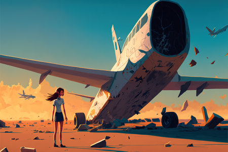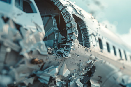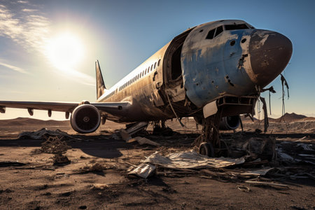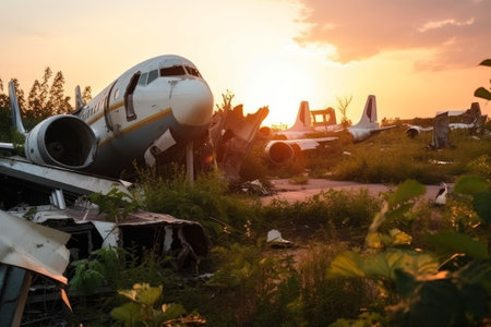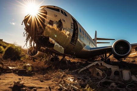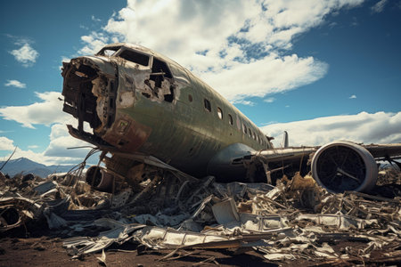 close-up of airplane wreckage with scattered debris, created with generative ai