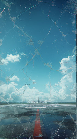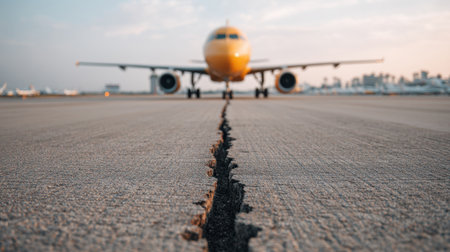 A low-angle view of a cracked runway with an airplane in the background, showcasing potential safety issues in airport infrastructure amid travel challenges.