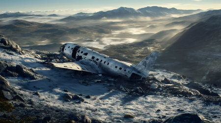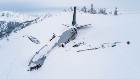 Airplane crash site in snowy mountains, illustrating concepts of aviation accidents, survival, and rescue