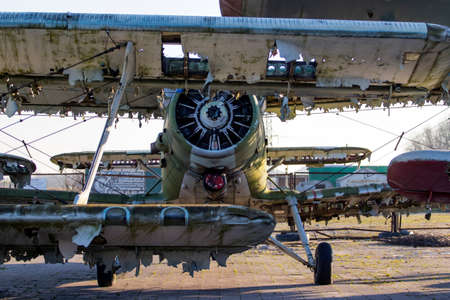 Old abandoned biplane in daylight