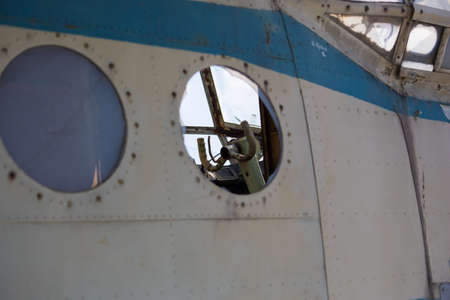 Fuselage of a damaged passenger plane, hole in a window.