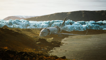 An abandoned airplane rests solemnly on a desolate black sand beach. Creating using generative AI tools