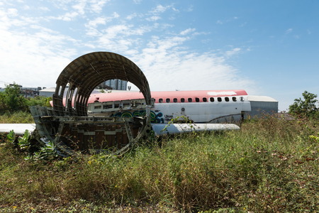 The airplane wreck old and scrap broken airplane. Exterior of an old rusted airplane fuselage iron